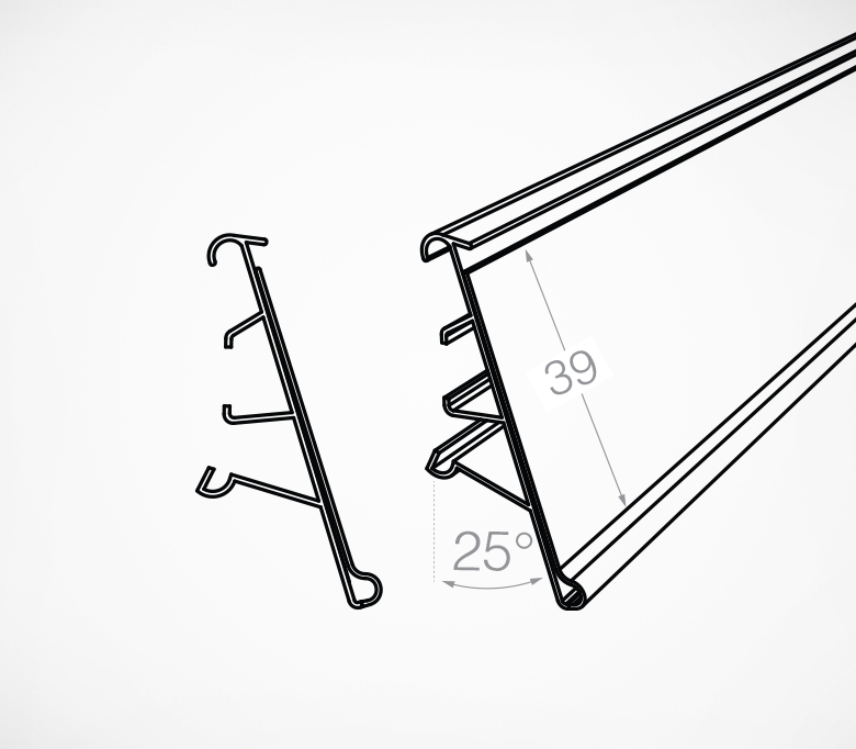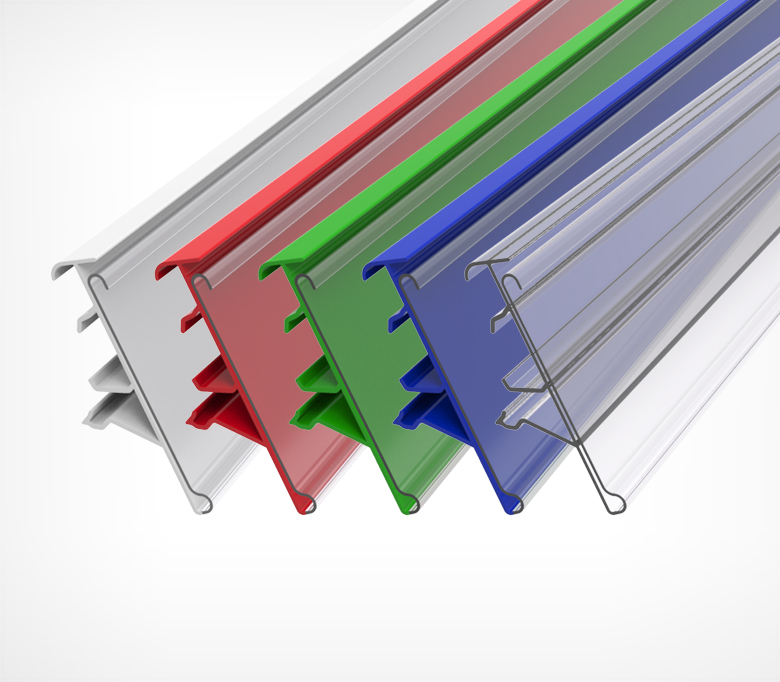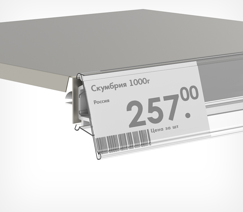 Полочный профиль предназначен для размещения ценников в открытых холодильниках, исключающих применение клейкой ленты. Устанавливается в холодильные витрины с помощью специальных зажимных клипс, приобретаемых отдельно. Рекомендовано для ценников и вкладышей высотой до 39 мм.