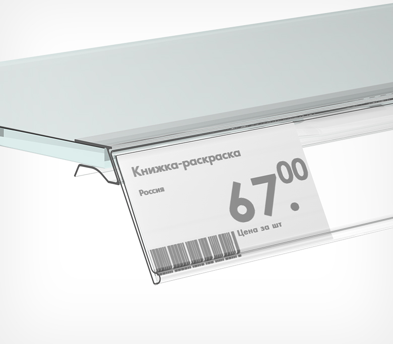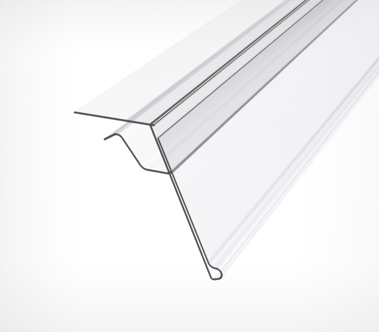 Полочный профиль для размещения ценников на стеклянных или деревянных полках толщиной до 10 мм. Презентует информацию под углом 20 градусов к поверхности, на которую установлен. Высота вставки - 39 мм.
