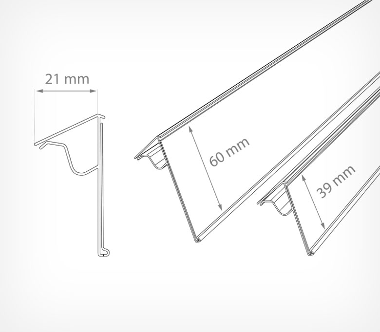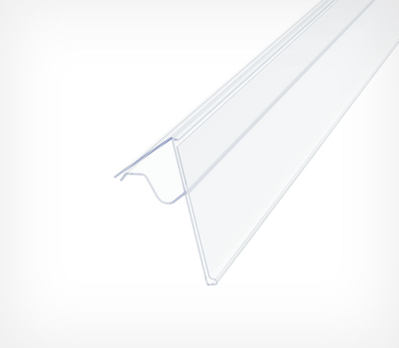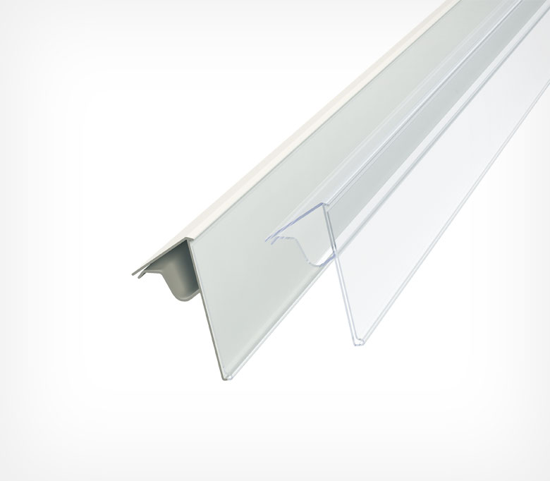 Хорошее решение для оснащения продуктовых и строительных гипермаркетов, где имеются металлические корзины или торговое оборудование с металлическим прутом до 8 мм в диаметре. Профиль одевается на прут и презентует информацию под углом 45 градусов к поверхности, на которую установлен. Высота вставки - 39 мм.