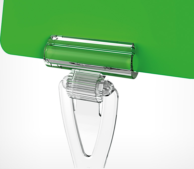 Деталь сборной конструкции типа Дели - держатель ценника. Позволяет фиксировать бумажные, картонные вставки, ПВХ-карманы, черные таблички. В сборе другими деталями типа Дели: пластиковой иголкой, соединителями 40 мм и 90 мм, зажимом на край посуды и пластиковой подставкой, образует готовую конструкцию для размещения ценников, в основном, в отделах "Гастрономия", "Кулинария".