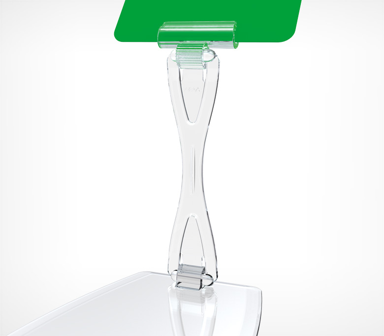 Деталь сборной конструкции типа Дели - соединитель высотой 90 мм. Играет роль переходника между держателем ценника и одним из креплений: пластиковой подставкой, зажимом на край посуды. В сборе с ними образует готовые конструкции для размещения информации о товаре, в основном, используется в отделах "Гастрономия", "Кулинария". Может комплектоваться в сборе с рамками серии Техно-мини и специальными переходниками для их установки.