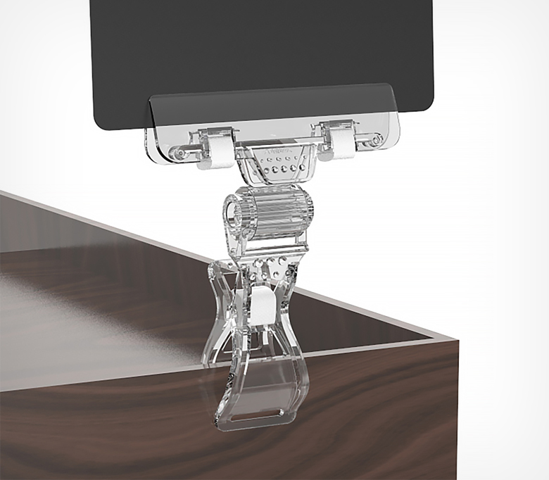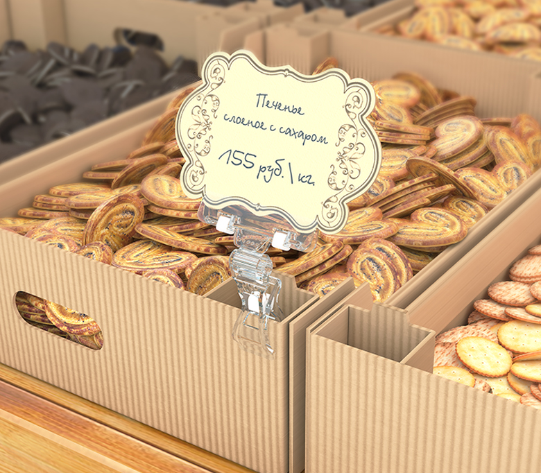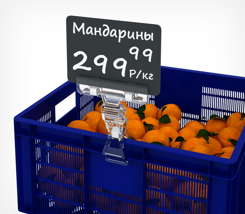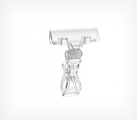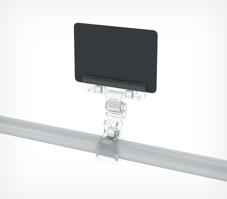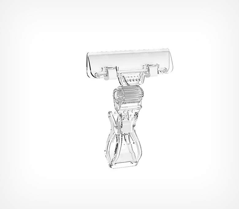 Держатель ценника с двумя прищепками. Низ легко крепится на корзину или другую ёмкость, верх используется с различными вставками до 6 мм.