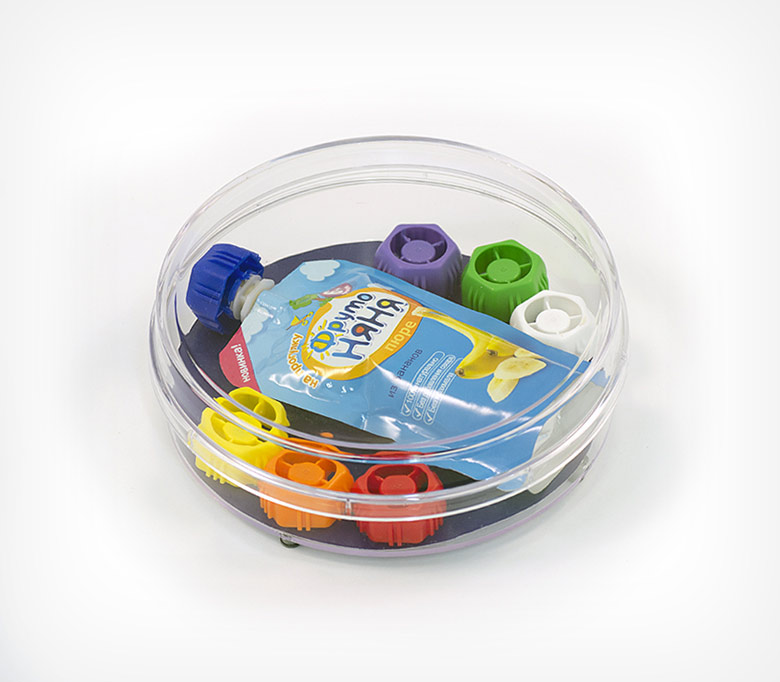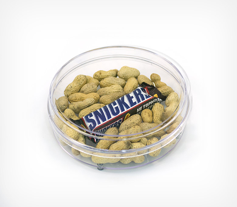 Кассовую зону не возможно представить без данного аксессуара. Монетница выполняет роль как рекламного носителя, так и средства для приема денег, выдачи сдачи в магазине. Данного вида монетница имеет круглую форму, диаметр которой 174 мм. Особенностью является то, что она увеличена по высоте до 56 мм и может вместить муляж какого-либо товара, либо реальный товар небольшого размера. Четыре резиновые ножки в основании монетницы предотвращают ее скольжение.