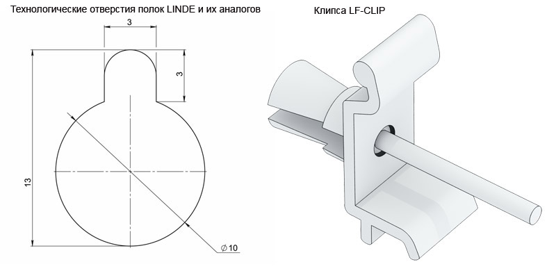 LF39 предназначены для полок холодильных витрин  LINDE и их аналогов – любых полок, которые имеют технологические отверстия диаметром 10 мм в соответствии с чертежом ниже: