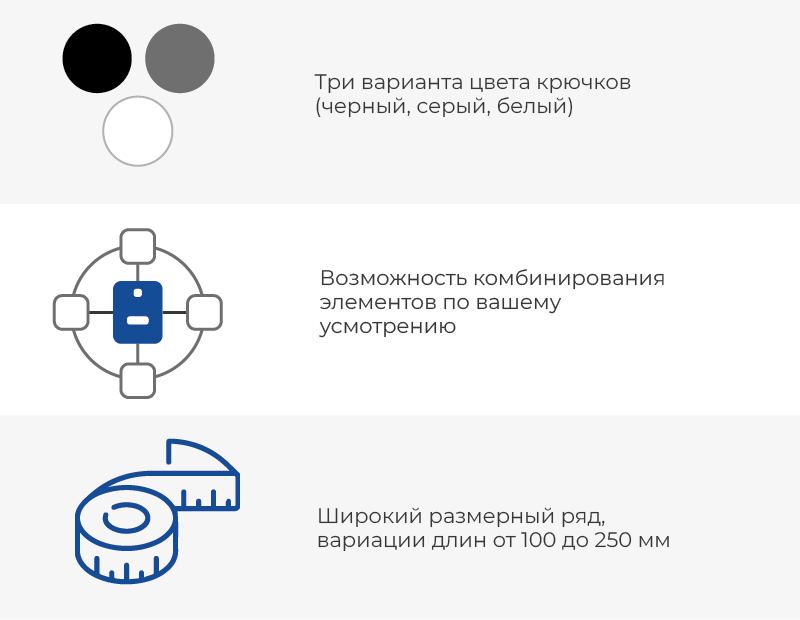 Прекрасное решение для демонстрации товаров с любым вариантом подвесного крепления (крючок, европодвес, отверстие, петля).