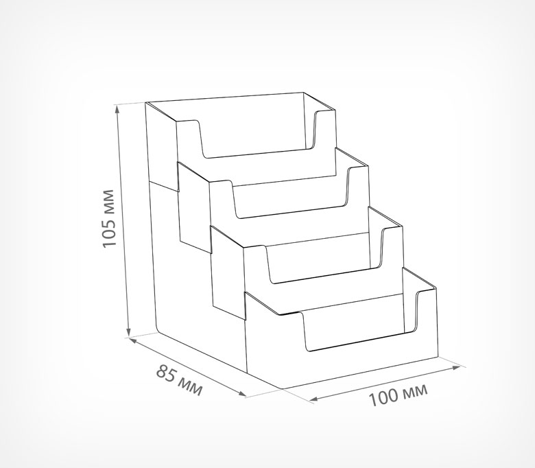Многоуровневая визитница с 4-мя отделениями. Дает возможность расположить визитки в 4 уровня, способствует удобному захвату пальцами. Устанавливается на столы, полки, стойки либо подвешивается на двусторонний скотч на стену.