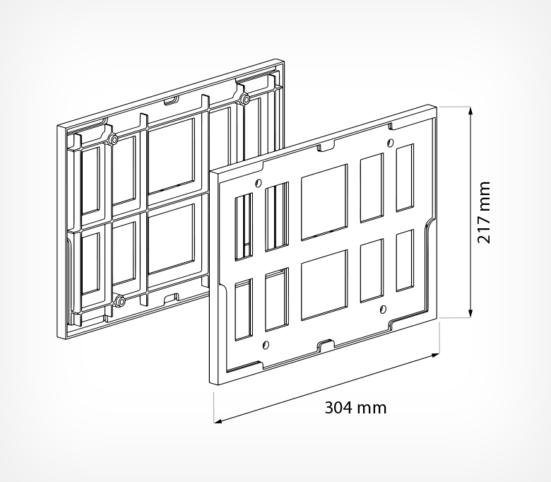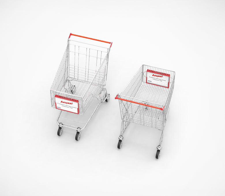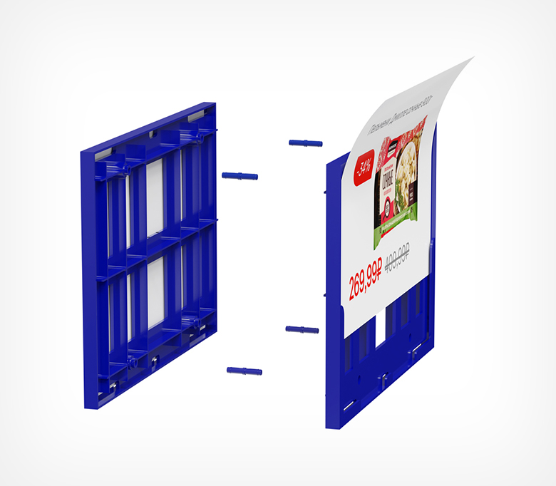 Комплект из двух пластиковых рам формата А4. Служит для размещения на передней части покупательских тележек рекламной информации. Может использоваться с бумажными, ламинированными вставками, которые дополнительно могут быть помещены в защитный карман из ПВХ.