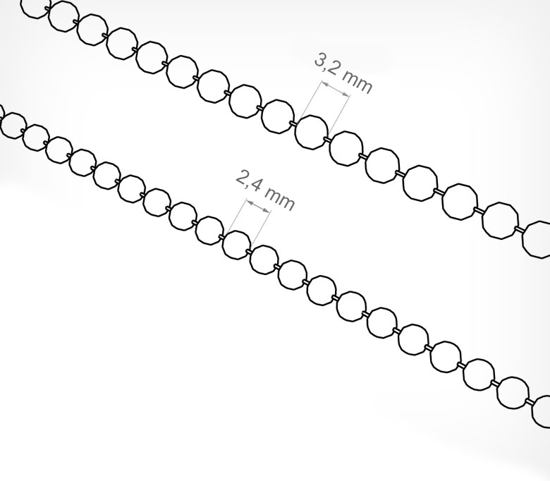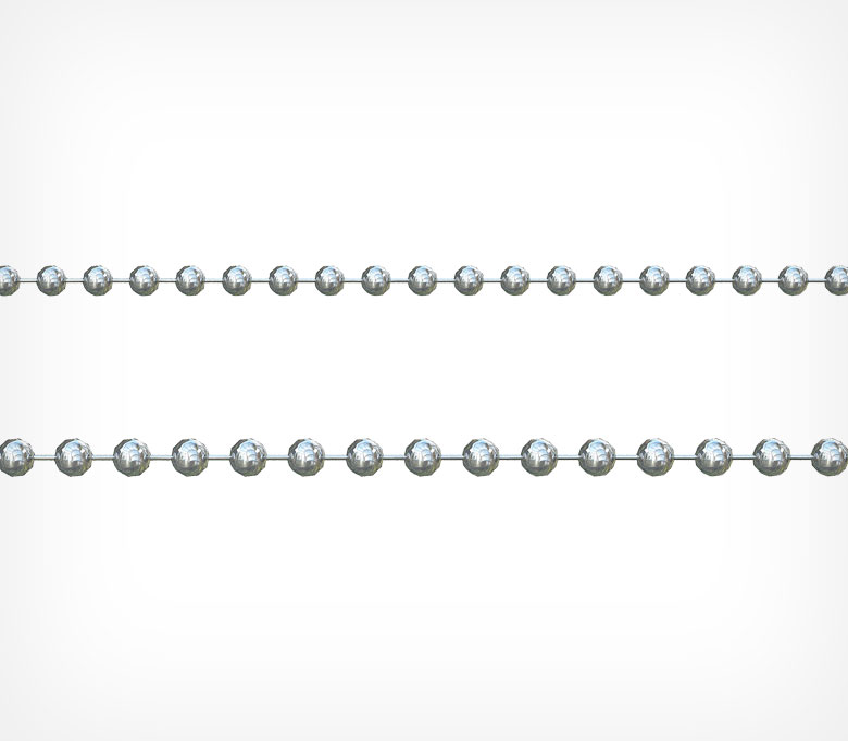 Цепочка, из нанизанных на прочную металлическую нить шариков диаметром 2 мм; 2,4 мм; 3,2 мм. Служит в качестве удобного соединительного либо декоративного элемента. Подходит для крепления ярлыков, ценников к товару (бижутерия, заколки, косметика, игрушки и т.д.). Для соединения в замкнутую конструкцию, с возможностью размыкания, применяют замок BC-CONNECTOR.