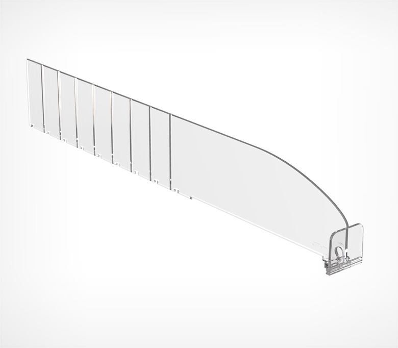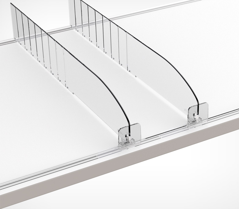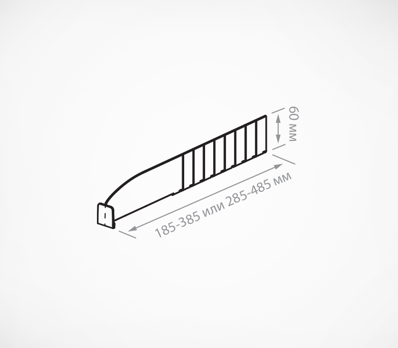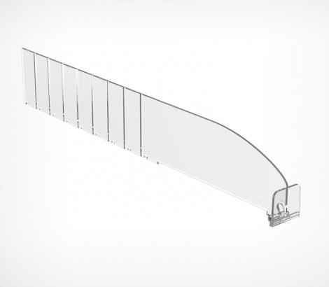 Разделитель высотой 60 мм изготовлен из прозрачного поликарбоната. Позволяет аккуратно разложить небольшие упаковки, тюбики, банки, а также развесной товар по категориям. Имеет небольшие насечки с шагом 25 мм, позволяющие обламывать его и подгонять размер под ширину полки, а также Т-образный держатель высотой 30 мм спереди, который удерживает товар на полке.