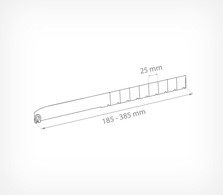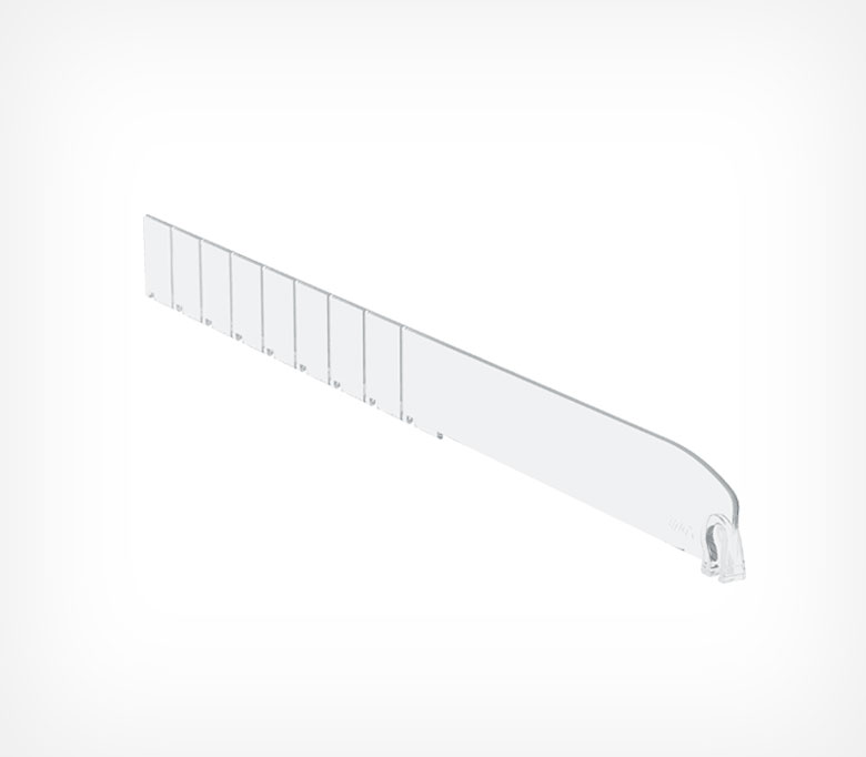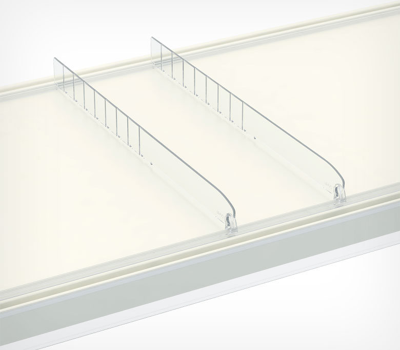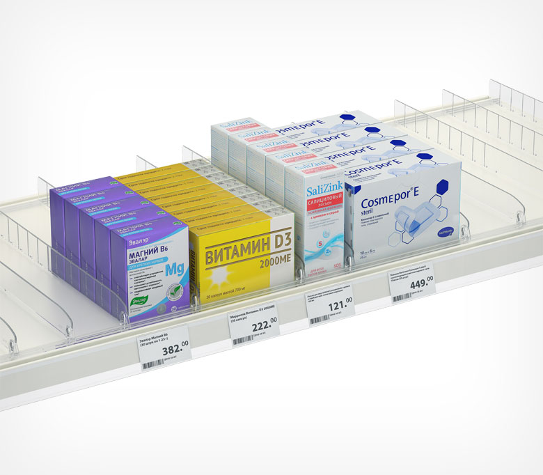 Отделить товар одной категории от другой, создать «умное» зонирование пространства позволяет пластиковый прозрачный разделитель. На нем имеются небольшие насечки, позволяющие обламывать и подгонять его размеры под ширину полки. Разделители высотой 30 мм, в основном, применяются для выкладки препаратов в аптеках, а также сигарет и мелкой бытовой химии в торговых сетях.
