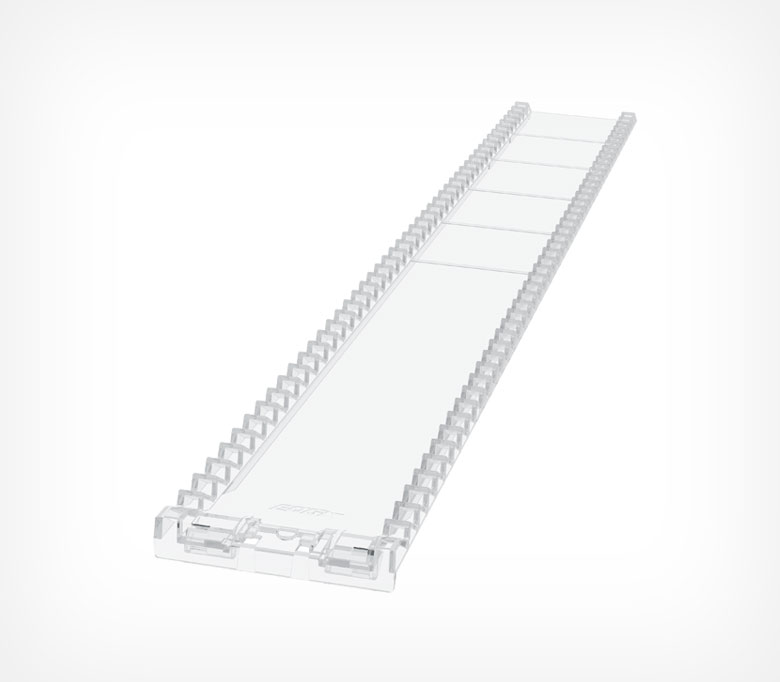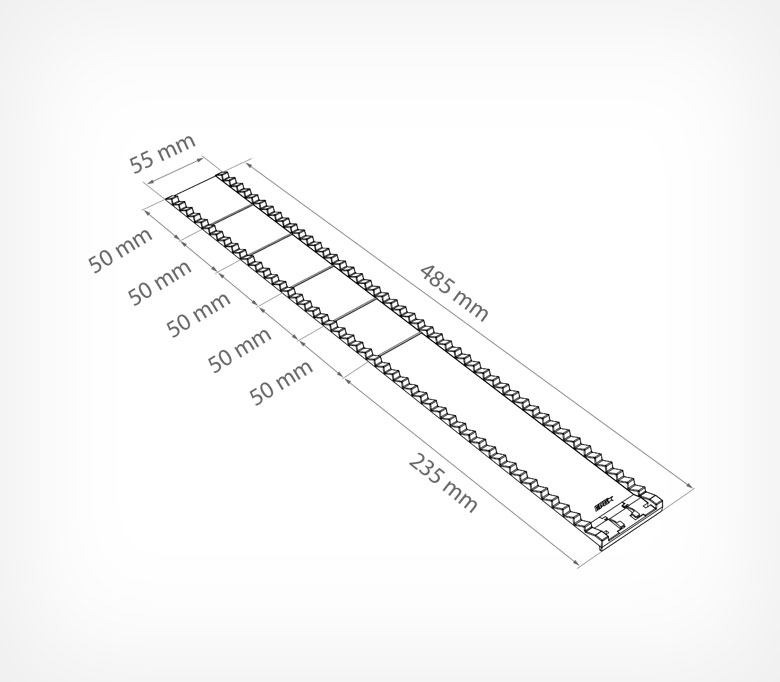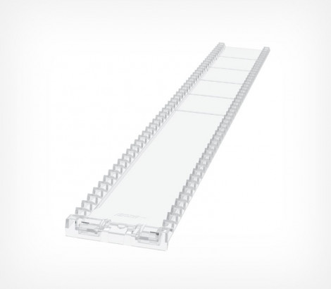 Крепление "Лесенка" служит для фиксации пластиковых опор, защелкивается на L-образном либо Т-образном профиле. Мелкие частые гребни расположены с одинаковым шагом, что позволяет соблюдать дистанцию между впереди стоящим и последующим товаром, и предотвращает падение товара.