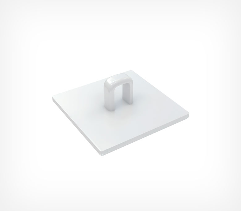 Крепеж из пластика с небольшим ушком-петлей для подвешивания рекламных конструкций. Прикрепляется к потолку либо снизу навесной полки на вспененную клеевую основу. Рекомендуется для легких баннеров, пластиковых профилей небольшой длины (600мм), мобайлов из картона.