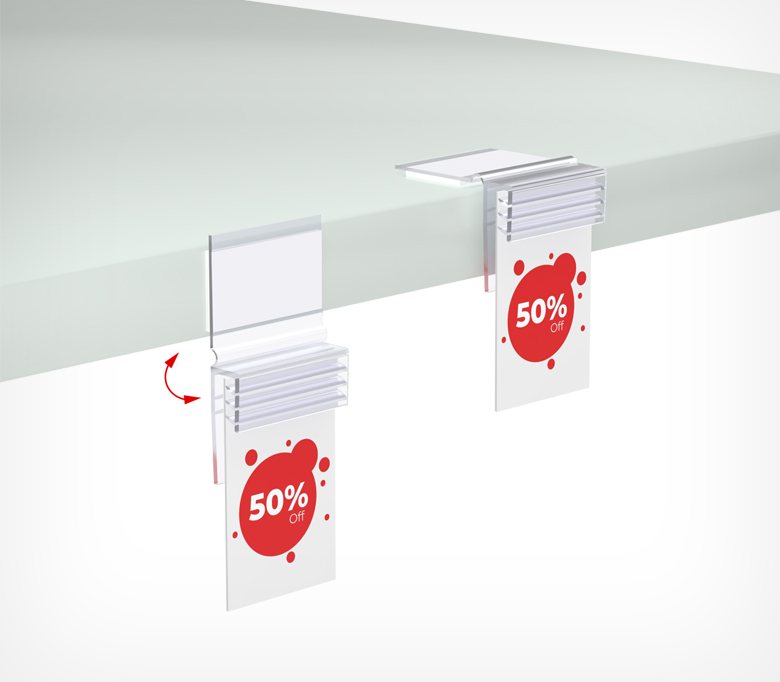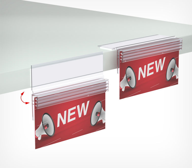 Гибкий держатель SGFD-FLEX для крепления ценников и табличек под углом. Откидывается при касании. Подходит для материалов толщиной 0,5–3 мм и лёгких металлических табличек до 0,7 мм. Фиксируется на самоклеящуюся основу. Выпускается в длинах 25 и 75 мм.