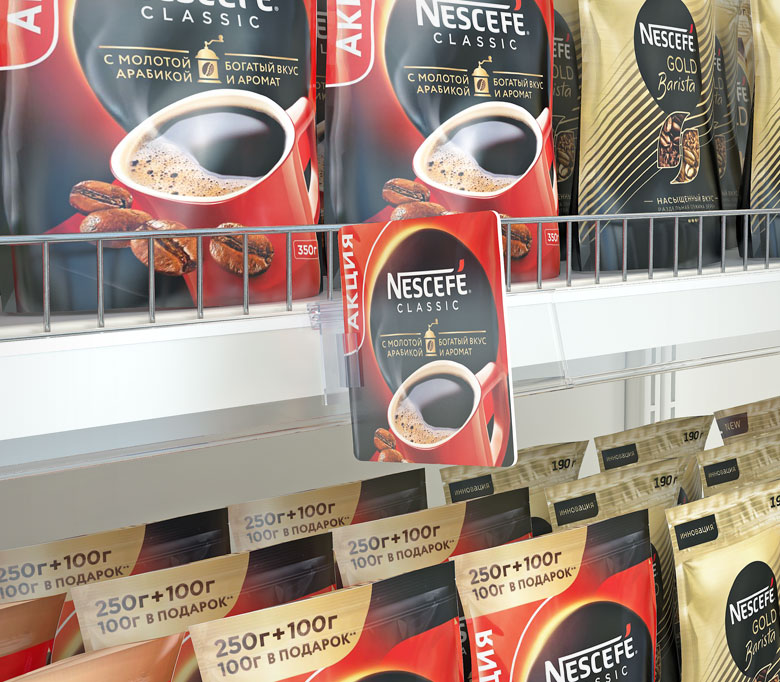 Одна из разновидностей держателей вывески типа "акула". Крепится на полочный ценникодержатель, фиксирует вставку из картона, ламинированной бумаги в заданном положении. Толщина вставки варьируется 0,5-3 мм.